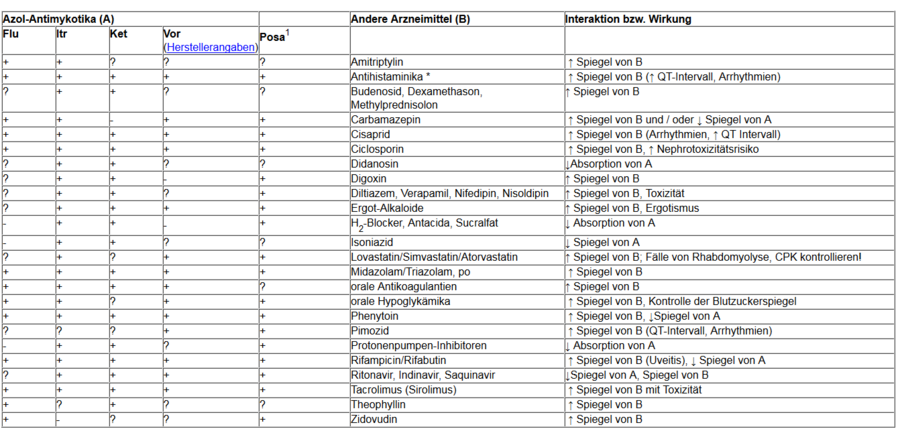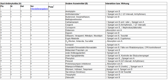 Tabelle: Interaktionen zwischen Fluconazol, Itraconazol, Ketoconazol, Voriconazol und Posaconazol und anderen Arzneistoffen Um die Tabelle zu vergrößern klicken Sie auf die Tabelle! |