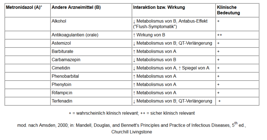Metronidazol (CLONT u.a.) wurde bereits vor 4 Jahrzehnten zur Behandlung der Trichomoniasis entwickelt. Heute wird es darüber hinaus routinemäßig bei Infektionen durch anaerobe Bakterien angewandt. Im Laufe der jahrzehnte-langen Anwendung des Arzneimittels sind einige Interaktionen mit anderen Arzneistoffen aufgefallen, die bei der Gabe von Metronidazol berücksichtigt werden müssen. Es soll jedoch darauf hingewiesen werden, dass die Datenlage natürlich nicht mit einem heute entwickelten Arzneimittel verglichen werden kannn - so wurden zum Bespiel keine systematischen Studien zur Frage möglicher Wechselwirkungen durchgeführt. Die Erkenntnisse beruhen weitgehend auf Fallberichten. Der Mechanismus der Interaktionen mit oralen Antikoagulantien und mit Lithiumpräparaten ist nicht geklärt. Zu den am längsten bekannten Interaktionen gehört die Wechselwirkung mit Alkohol. Nach gängiger Lehrbuchmeinung führt Metronidazol – ähnlich wie das Medikament Disulfiram (ANTABUS) – zu einem Block des Ethanolabbaus, woraus eine Anreicherung von Acetaldehyd resultiert. Die toxischen Wirkungen dieses Intermediärproduktes sind wahrscheinlich für die beobachtete „Flush-Symptomatik“ verantwortlich (Hautrötungen im Bereich des Kopfes und Nackens), sowie für weitere Symptome, wie Übelkeit und Erbrechen. Die Interaktion mit Alkohol wurde sogar nach intravaginaler Anwendung des Wirkstoffs beschrieben und schon mit plötzlichen Todesfällen in Zusammenhang gebracht.1 Neuere Arbeiten stellen dennoch viele dieser Berichte in Frage und verweisen darauf, dass in den ursprünglichen Mitteilungen zu Beginn der sechziger Jahren die Absicht geäussert wurde, Metronidazol für die Therapie der Alkoholkrankheit zu entwickeln. Es kann vermutet werden, dass die Interpretation der Fallberichte daher nicht mit der notwendigen Objektivität erfolgte. Die Datenlage ist demnach keinesfalls so eindeutig, wie allgemein angenommen wird.2 Es ist bemerkenswert, dass selbst bei einer derart „berühmten“ Arzneimittelwechselwirkung, die Datenlage als unzureichend bezeichnet werden muss. Aus Sicherheitsgründen wird dennoch nach wie vor empfohlen, auf den Genuss alkoholischer Getränke während einer Behandlung mit Metronidazol zu verzichten.