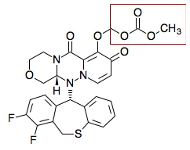 Der rot markierte Teil des Moleküls wird bei der Resorption abgespalten (Prodrug). Die Grundstruktur ist ähnlich wie bei Dolutegravir und anderen Integrasehemmern, die zur antiretroviralen Therapie verwendet werden. Die Virustatika haben eine Affinität für zweiwertige Kationen.