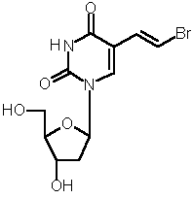 Strukturformel von Brivudin, einem Thymidinanalogon. Im Gegensatz zu anderen Nukleosidanaloga ist die Base verändert, nicht der Zuckeranteil. Durch Abspaltung der Desoxyribose erfolgt der Abbau zu Bromvinyluracil (BVU).