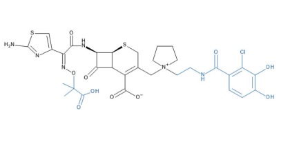 Strukturformel Cefiderocol (= S-649266; MM 752). Ähnliche Struktur wie Cefepim, blau markiert sind die Unterschiede zwischen den beiden Cephalosporinen. Der modifizierte Catecholrest bindet dreiwertiges Eisen, der Komplex wird dann aktiv in die Bakterienzelle transportiert.