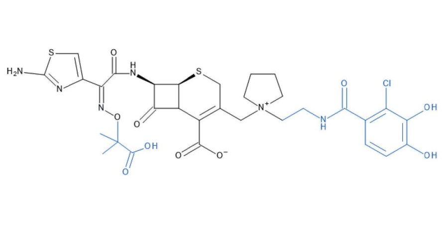 Cefiderocol besitzt einen Aminothiazolrest in Position 7 des Grundgerüstes, der seit den 1980er Jahren in vielen Cephalosporinen vorhanden ist. Die Carboxylgruppe in der Seitenkette erhöht die Wasserlöslichkeit und die Penetrationsfähigkeit durch die äußere Zellmembran, es handelt sich um ein gemeinsames Strukturmerkmal mit Ceftazidim und Ceftolozon. Der positiv geladene Pyrrolidiniumring ist auch im Cefepim vorhanden, er erhöht die antibakterielle Aktivität und Stabilität gegenüber ß-Laktamasen. Ein neuer, bisher in dem „Baukastensystem“ der Cephalosporine nicht verwendeter Rest ist die Catecholstruktur im C3-Substituenten. Hier findet die Bindung an das Eisenion statt.
