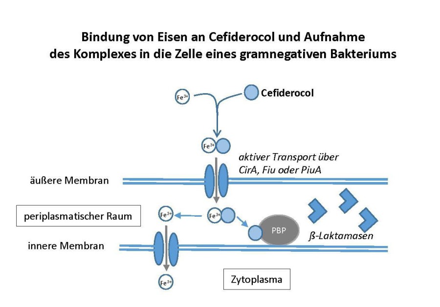 Cefiderocol wird über Eisentransporter aktiv in die Bakterienzelle aufgenommen. Es ist stabil gegenüber den ß-Laktamasen im periplasmatischen Raum der gramnegativen Bakterien.