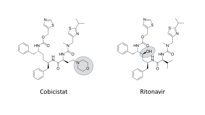 Abbildung 1. Strukturformeln Ritonavir und Cobicistat im Vergleich. Cobicistat besitzt einen Morpholino-Rest anstelle einer Isopropylgruppe. Die für eine antivirale Aktivität erforderliche Hydroxylgruppe fehlt beim Cobicistat.