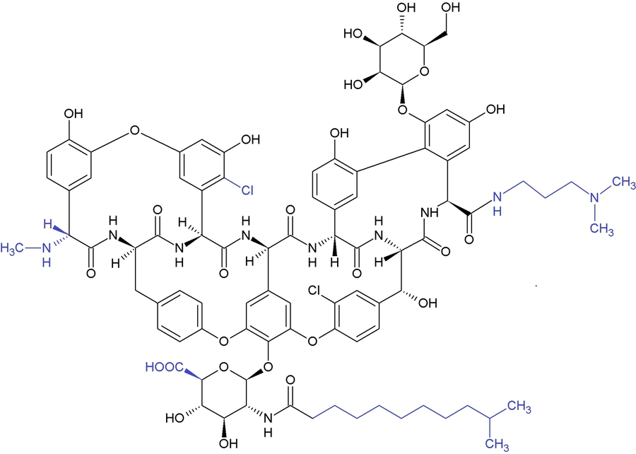 Strukturformel von Dalbavancin (B0-Komponente). Es besitzt eine ähnliche Struktur wie andere Glykopeptide. Dalbavancin ist ein Heptapeptid mit kovalenter Verbrückung der phenolischen Seitenketten. Die Unterschiede zu Teicoplanin sind blau markiert (z. B. längere lipophile Seitenkette, zusätzliche Carboxylgruppe, terminale Methylaminogruppe). Ein Acetylglucosaminrest fehlt bei Dalbavancin, ein Chloratom ist an anderer Stelle positioniert.