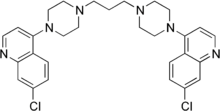 Strukturformel von Piperaquin. Der Wirkstoff gehört wie Chloroquin zu den 4-Aminochinolin-Derivaten. Als Bis-Chinolin besteht jedoch auch eine Aktivität gegen Chloroquin-resistente Plasmodien.