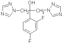Charakteristische Bestandteile des Fluconazol-Moleküls sind zwei Triazol-Reste, eine tertiäre Alkoholgruppe und ein mit zwei Fluor-Atomen substituierter