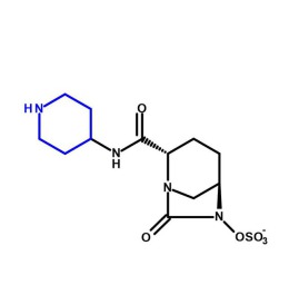 Abbildung: Strukturformel von Relebactam (MK-7655, MM 348). Der Unterschied zu Avibactam besteht in einem zusätzlichen Piperidinring (blau). Beide Inhibitoren sind Diazabicyclooctanone (DBO).