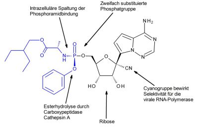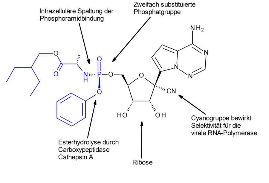 Nukleosidanaloga stellen unter den antiviral wirksamen Arzneimitteln die größte Gruppe dar. Aciclovir war der erste Wirkstoff aus dieser Gruppe, der eine gute Nutzen-Risiko-Relation aufwies und seit Jahrzehnten bei Herpes-Infektionen angewandt wird. Nukleoside sind heute wichtige Bestandteile der antiretroviralen Therapie, sowie bei chronischen Verläufen der Hepatitis B und C. Etwa 1.000 Nukleosid- und Nukleotid-Analoga wurden gescreent, um Wirkstoffe gegen Filoviren (Ebola), Coronaviren oder Flaviviren – dazu gehören Dengue- und Zika-Viren - zu identifizieren. Von besonderem Interesse ist Remdesivir (GS-5734), das Derivat eines C-Nukleosid-Monophosphats mit Phosphoramidat-Struktur. Es leitet sich von einem Adenin-ähnlichen Heterozyklus ab, die Phosphatgruppe ist mit zwei Gruppen verbunden, die zunächst abgespalten werden müssen, bevor die Substanz zum wirksamen Triphosphat umgewandelt werden kann.