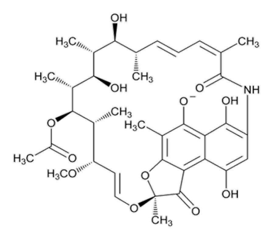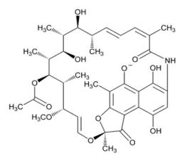 Strukturformel Rifamycin SV. Das Molekulargewicht des makrozyklischen Ansamycin-Antibiotikums beträgt 720 g/mol (Natriumsalz).
