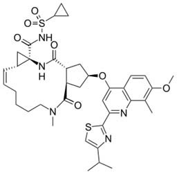 Strukturformel Simeprevir (749,9 g/mol). Im Unterschied zu den beiden anderen Proteaseinhibitoren Boceprevir und Telaprevir mit einer linearen, peptidähnlichen Struktur weist Simeprevir eine makrozyklische Struktur auf.